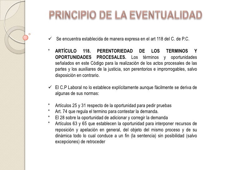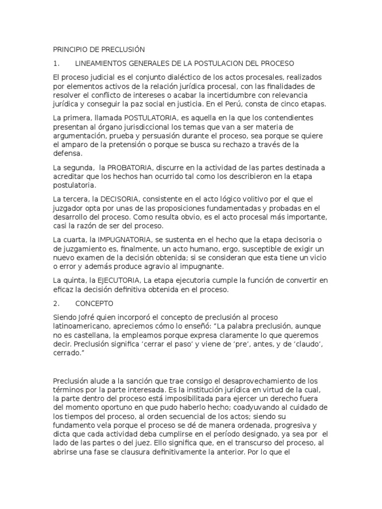 Principio de Preclusion | Impedimento colateral | Derecho ... from imgv2-1-f.scribdassets.com Preclusión es la pérdida, extinción o caducidad de una facultad o potestad procesal prscripción: Por ejemplo, no interponer algun recurso, ni ofrecer alguna prueba, o omtir alegar, dentro del termino legal, ocasiona la pérdida irremediable de tal facultad procesal. De acuerdo con el primero, de cuya aplicación suministra un ejemplo la ordenanza procesal civil alemana, los distintos actos que integran el proceso no se hallan sujetos a un orden consecutivo. Está representado por el hecho de que las diversas etapas del proceso se desarrollan en. Jul 15, 2016 · jurisprudencia video del principio de preclusión sentencia del juicio no. Con respecto al orden en que deben cumplirse los actos procesales, existen, en la legislación comparada, dos principio s básicos: El de unidad de vista o de indivisibilidad y el de preclusión. El principio de preclusion consiste en una sanción por inactividad procesal que provoca la consumación de una facultad procesal.